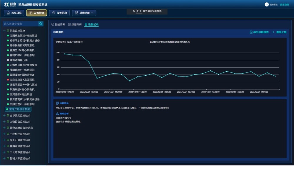 凯泉故障诊断专家系统是一款基于AI算法的智能振动诊断系统,能够对复杂工况下的泵设备振动数据进行大数据建模和智能分析,实现故障预警、报警、智能分类和判定,以及故障处理跟踪等功能。